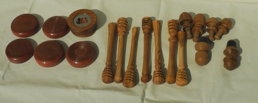 Kronkorken Öffner (die flachen, runden Teile)  aus Massaranduba  (Pferdefleischholz, Reste unserer Terrassentreppe)