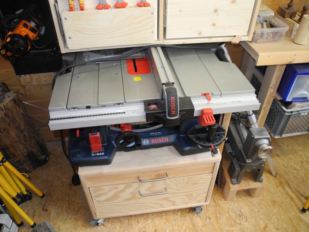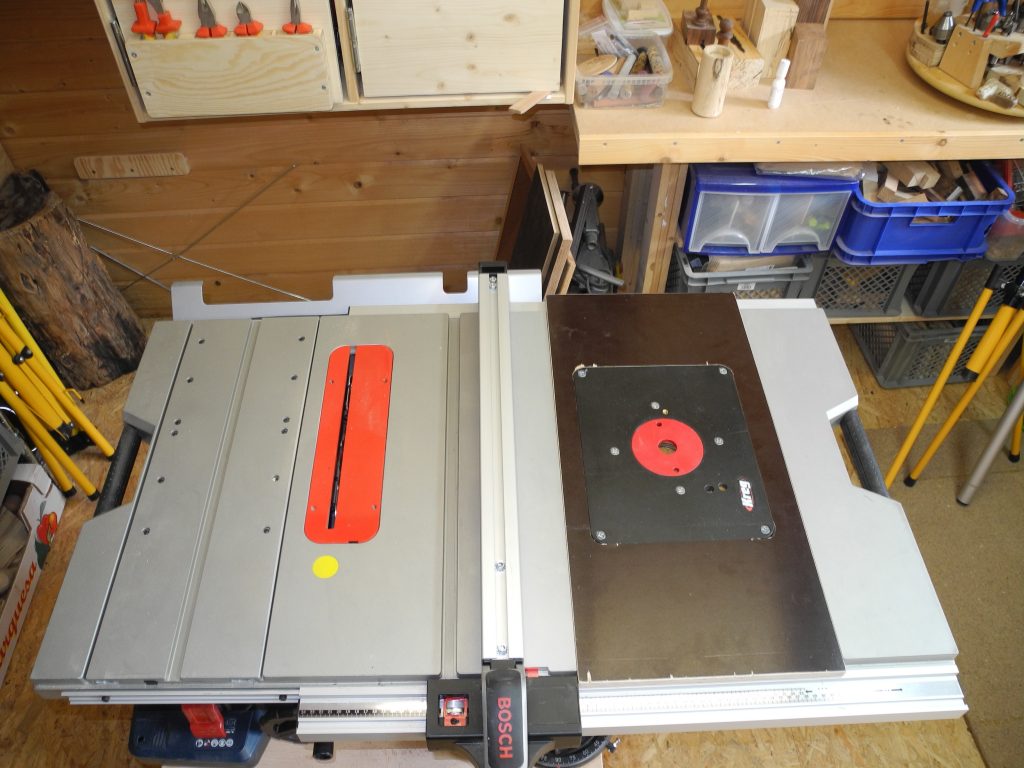 seitlich verstaut, die Oberfräse mit Einlegeplatte, die in den Sägetisch eingepasst werden kann.