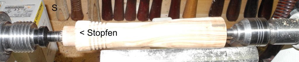 Mit einem selbstgedrechselten Holzstopfen können Sie die 15 mm Bohrung verschließen, um den Griff nun nach eigener Vorstellung zwischen den Spitzen fertig zu drechseln, zu schleifen und die Oberfläche nach Wahl zu behandeln. Um ein Wegrollen des Werkzeugs zu verhindern kann eine flache Längsseite angeschliffen werden.